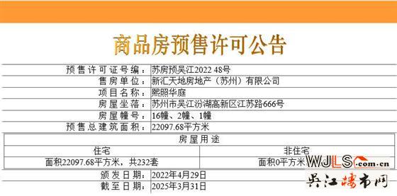 4月29日,在时隔11个月之后,汾湖高新区的新天地熙照华庭第二次领取预售证,预售证编号:苏房预吴江2022048号,预售总建筑面积22097.68㎡,共232套住宅。