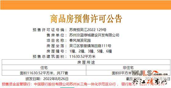8月26日,吴江区 汾湖高新区的春风湖滨首次取证,预售证编号:苏房预吴江2022129号,预售总建筑面积11630.52㎡,共77套住宅。